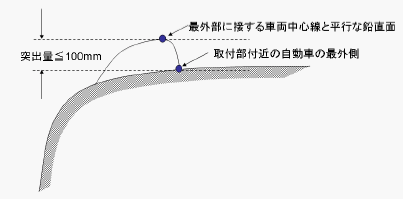 | 道路運送車両の保安基準の細目を定める告示【2010.3.29】〈第一節〉第22 条(車枠及び車体) (車枠及び車体) 第22 条 4.自動車の窓、乗降口等の扉を閉鎖した状態において、次のいずれかに該当する車枠及び車体は、第2項第4号の基準に適合しないものとする。ただし、第2項第1号の自動車(平成20年12 月31 日までに製作された専ら乗用の用に供する乗車定員10 人未満の自動車及び第2項第1号のただし書きにより同号の基準の適用を受けない自動車を除く。)にあっては、この限りでない。 一 バンパの端部であって、通行人の被服等を引掛けるおそれのあるもの 二 後写鏡の取付金具に鋭利な突起を有しているもの 三 スピンナー、ウイングナット等、車輪に取り付けるプロペラ状の装飾品を有するもの 四レバー式のドア・ハンドルで先端が自動車の進行方向を向いているもの(先端が内側へ曲げてあるもの、保護装置を有するもの等他の交通の安全を妨げるおそれの少ないものを除く。) 五 貨物自動車に備える簡易クレーンのクレーンブームであって、その車両前方への突出量及び前端の取付け高さが次に該当するもの イ 最前部の車軸中心からクレーンブームの最前端までの水平距離が軸距の3分の2を超えるもの ロ クレーン部を除く自動車の最前部(後写鏡、バンパその他の自動車前面に備える付属物を除く。以下第100 条第4項第9号ロ及び第178 条第4項第9号ロにおいて同じ。)からクレーンブームの最前端までの水平距離が1 m を超えるもの ハ クレーンブームの最前端の下縁の高さが地上1.8m 未満のもの(参考図) 六 専ら乗用の用に供する自動車(乗車定員10 人未満の自動車を除く。)に備えられているドア・ハンドル、充填口等であって、その付近の外側面から突出し、かつ、前方に対し適当な丸みが付けられていないもの又は適当な大きさの面取りがなされていないもの 七 専ら乗用の用に供する自動車(乗車定員10 人未満の自動車を除く。)に備えられているアンテナ、上ヒンジ開き窓であって、その附近の外側面から突出しているもの 八 二輪自動車に備えられているフェアリングであって鋭利な突起を有するもの 九 保安基準第41 条の装置のうち自動車の両側面に備えるものであって最外部に接する車両中心線と平行な鉛直面とその取付部付近の自動車の最外側との距離が100mmを超えて突出しているもの又はその方向指示器が車体に取り付けられた状態で直径100mm の球体が接触する範囲であってその外部表面の曲率半径が2.5mm 未満の突起を有するもの。ただし、突出量が5 mm 未満であってその外向きの端部に丸みが付けられているもの、突出量が1.5mm 未満のもの、突起の硬さが60 ショア(A)以下のもの又は自動車の幅から突出していないものにあってはこの限りでない。 (参考図) 5.乗車定員10 人未満の専ら乗用の用に供する自動車(二輪自動車、側車付二輪自動車、三輪自動車、カタピラ及びそりを有する軽自動車並びに被牽引自動車を除く。)以外のけん自動車、平成20 年12 月31 日までに製作された専ら乗用の用に供する乗車定員10 人未満の自動車及び第2項第1号のただし書きにより同号の基準の適用を受けない自動車にあっては、次に掲げるものは第2項第4号の基準に適合しないものとする。 一 乗用自動車及びその形状が乗用自動車の形状に類する自動車(いわゆる貨客兼用貨物自動車、警察車のパトロール車等)の後部に備えるバンパ(その端部が、車体後部側面付近にあるものに限る。)であって、次に該当しないもの イ 車体の凹部に組み込まれているもの ロ 車体とのすき間が20mm を超えず、かつ、直径100mm の球体を車体及びバンパに接触させた場合において球体に接触することがないものであって、その端部付近の部分が車体側に曲げられているもの 二 地上1.8m 以下に備えられているアンテナの取付部であって、その付近の車体の最外側から突出しているもの 6.自動車の最後部の車軸中心から車体の後面までの水平距離(空車状態の自動車を平坦な面に置き巻尺等を用いて車両中心線に平行に計測した長さをいう。以下同じ。)に関し、保安基準第18 条第1項第3号の告示で定める基準は、最後部の車軸中心から車体の後面までの水平距離が最遠軸距の2分の1(物品を車体の後方へ突出して積載するおそれのない構造の自動車にあっては3分の2、その他の自動車のうち小型自動車にあっては20 分の11)以下であることとする。この場合において、車体には、クレーン車のクレーンブーム又はスキーバスの車室外に設けられた物品積載装置を含み、バンパ、フック、ヒンジ等の附属物を含まないものとし、車軸自動昇降装置付き自動車にあっては、車軸が上昇している状態及び上昇している車軸を強制的に下降させた状態においてそれぞれ計測するものとする。 7.次に掲げる自動車は、前項の「物品を車体の後方へ突出して積載するおそれのない構造の自動車」とする。 一 物品を積載する装置を有しない自動車 二 物品を積載する装置が次に該当する自動車 イ タン