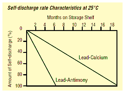 アンチモン鉛合金(Lead-Antimon)を電極に用いたハイブリッド・バッテリと、カルシウム鉛合金(Lead-Calcium)を電極に用いたカルシウム・バッテリの自己放電特性(横軸:ヶ月単位です)の比較です。