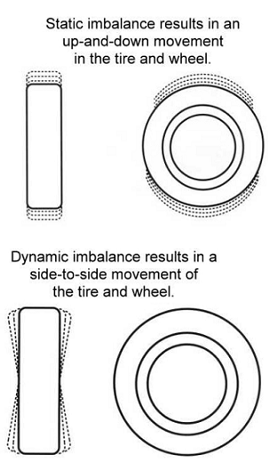 (2)タイヤ(ホイール付き)の一部が他の部分より重い場合、タイヤをゆっくり回転させると重い部分が下になって止まり、このアンバランスをスタティック・アンバランスという。