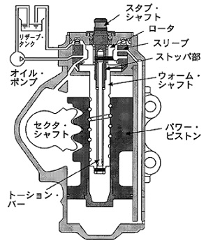 トーション・バーのねじれ角に応じて油圧を補助動力とし、操舵力を軽減しています。