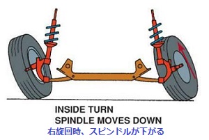 旋回時に車体が傾斜した場合のキャンバ変化は、車軸懸架式ではほとんど変化しないが、独立懸架式では大きく変化する。