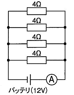 図に示す電気回路において、電流計Aが示す電流値として、適切なものは次のうちどれか。ただし、バッテリ、配線等の抵抗はないものとする。
