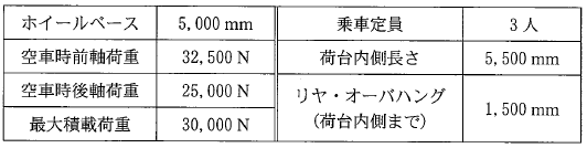 次の諸元を有するトラックの最大積載時の前軸荷重について、 適切なものは次のうちどれか。ただし、乗員1人当たりの荷重は550Nで、その荷重は前車軸の中心に作用し、 また、積載物の荷重は荷台に等分布にかかるものとする。